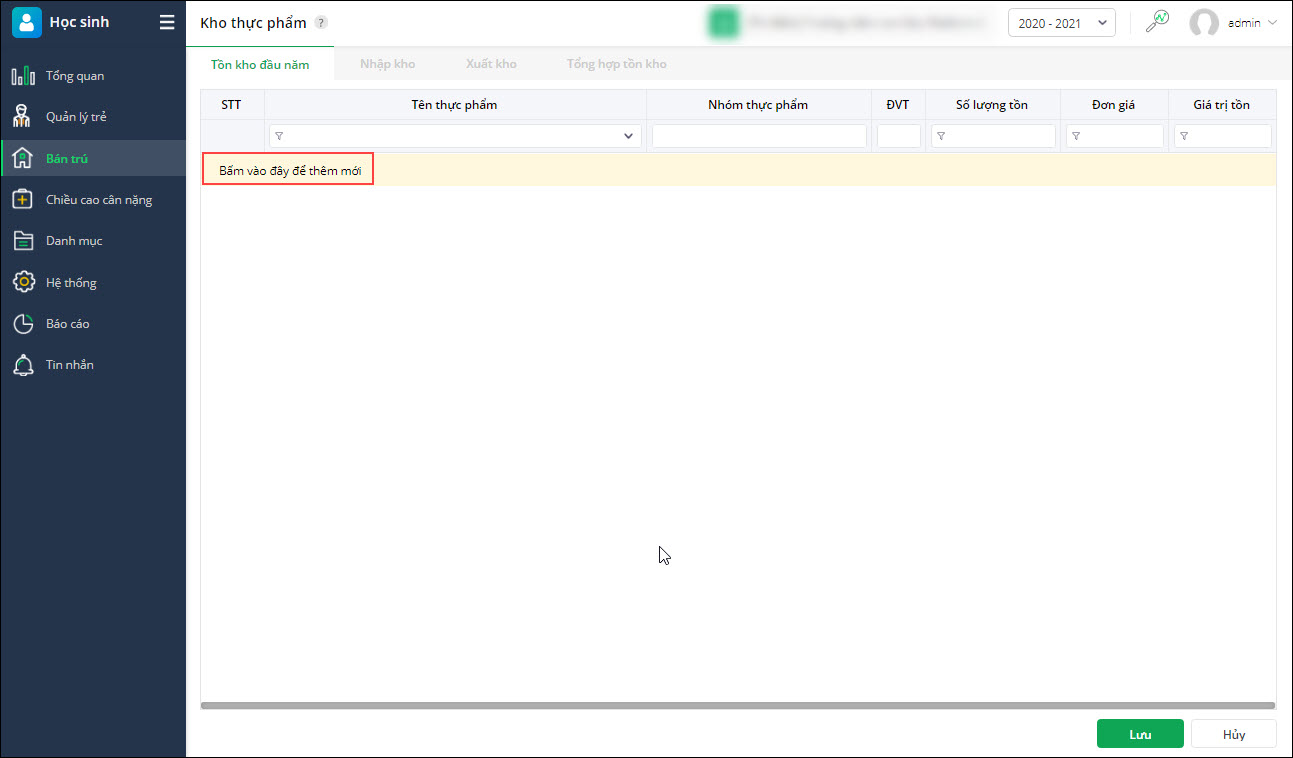 Lưu ý: Trong trường hợp thực phẩm mới chưa có trong danh mục của chương trình thì anh/chị cần thực hiện khai báo theo hướng dẫn tại đây, sau đó mới thực hiện khai báo Tồn kho ban đầu. - Nhấn Lưu.