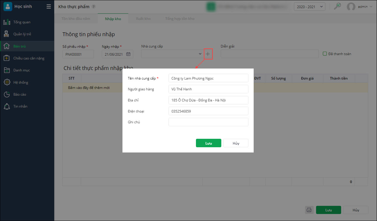 - Trong trường hợp anh/chị muốn lưu trữ thông tin nhà cung cấp để tiện khai báo cho các lần nhập kho tiếp theo thì anh/chị nhấn biểu tượng dấu cộng và thực hiện khai báo các thông tin nhà cung cấp. Nhấn Lưu.