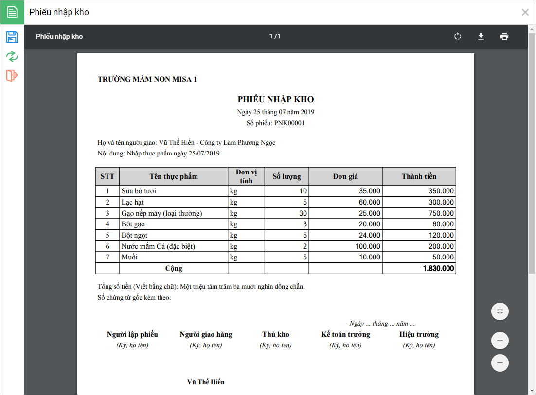 - Ngoài ra, anh/chị còn có thể in được phiếu nhập kho để dễ dàng theo dõi và đối chiếu với thực tế bằng cách sau:Tại màn hình Nhập kho thực phẩm, nhấn biểu tượng máy in.