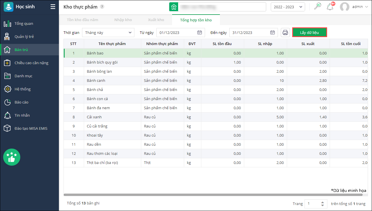 - Lựa chọn thời gian muốn theo dõi tổng hợp tồn kho. Nhấn Lấy dữ liệu