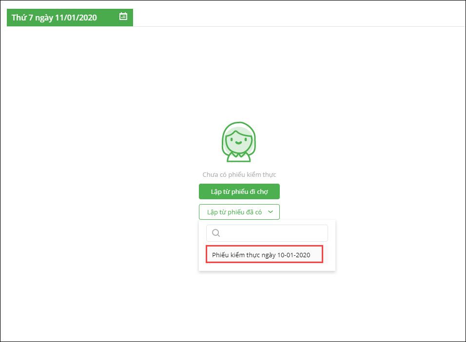 - Trường hợp này cán bộ dinh dưỡng cần khai báo thông tin Phiếu đi chợ. Phần mềm tự động lấy lên thông tin phiếu kiểm thực theo phiếu đi chợ đã lập.