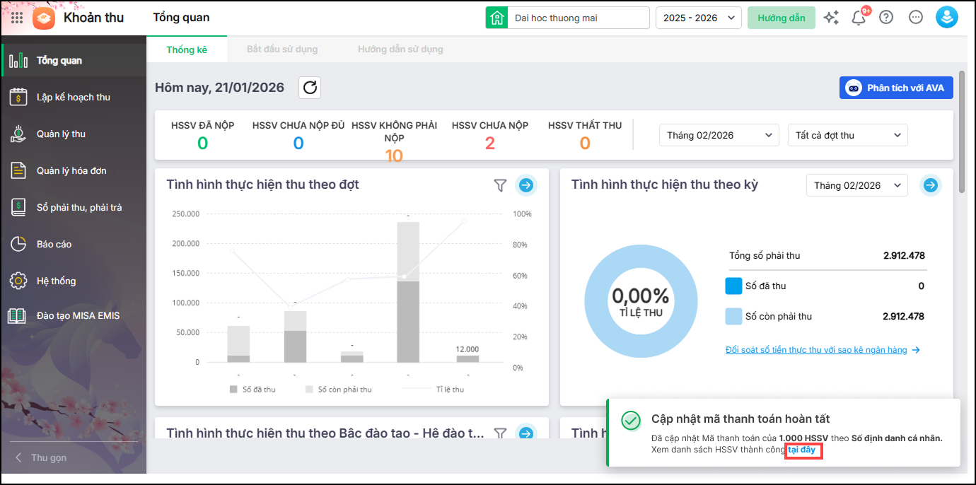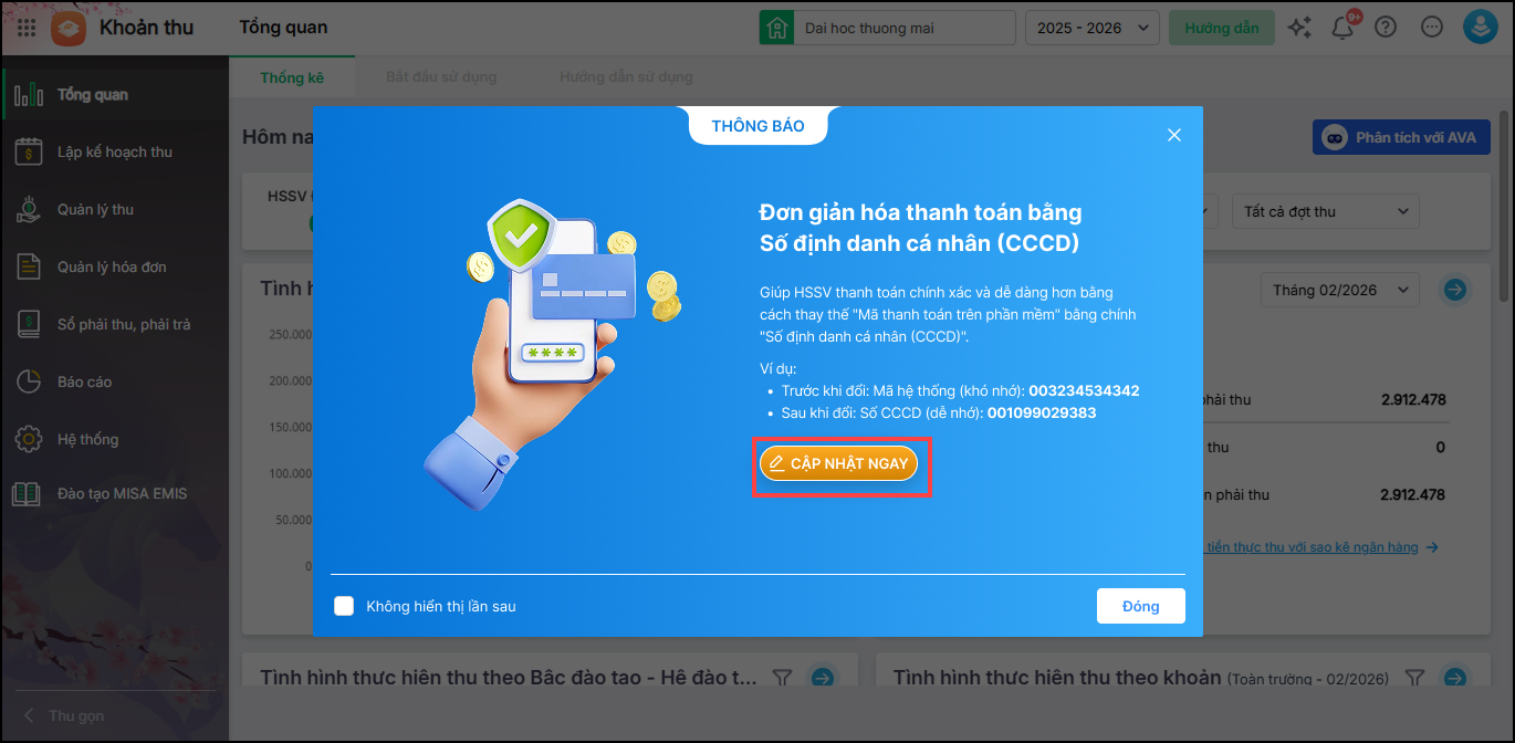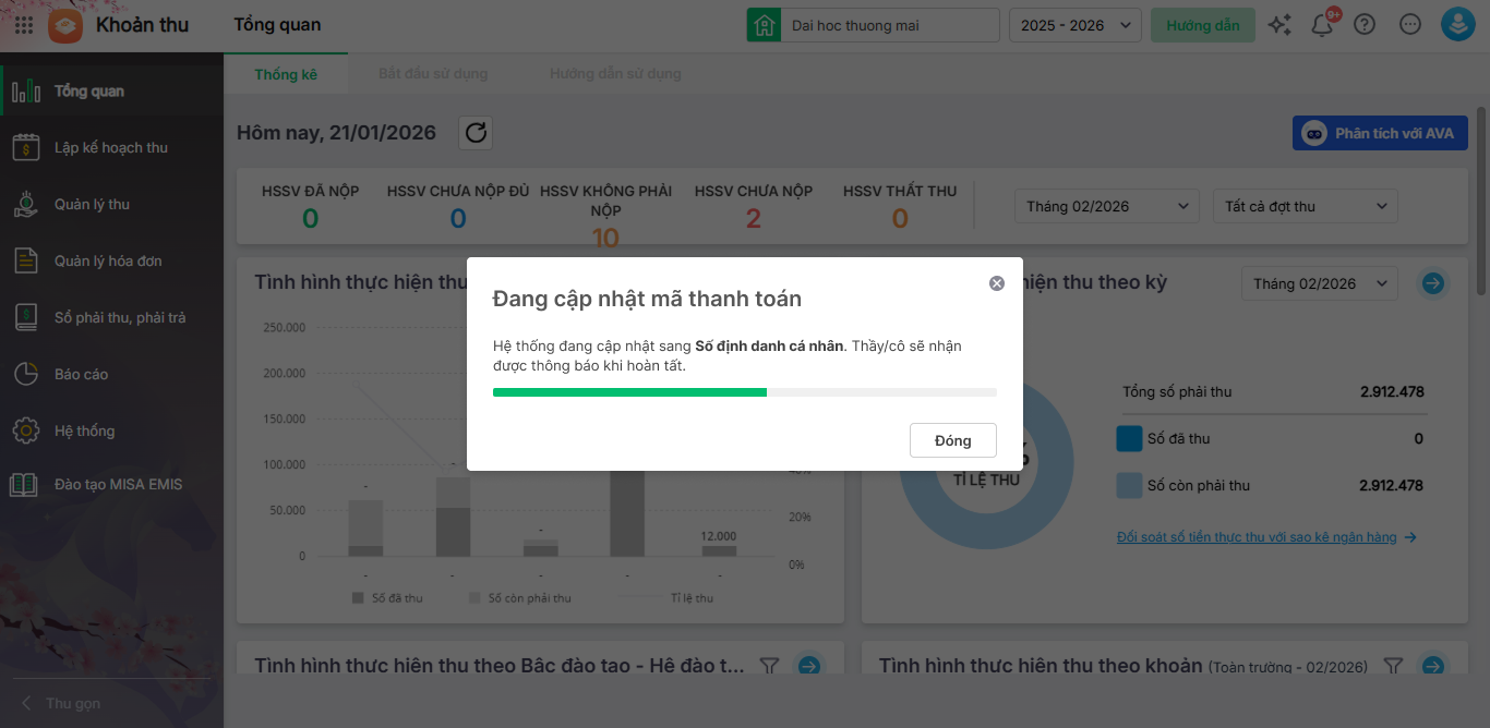 Bài viết hướng dẫn kế toán cập nhật mã thanh toán của học sinh, sinh viên theo mã định danh trên các báo cáo thu tiền để dễ dàng đối chiếu với file đối soát và thuận tiện cho công tác truyền thông tới học sinh, sinh viên về việc thanh toán.