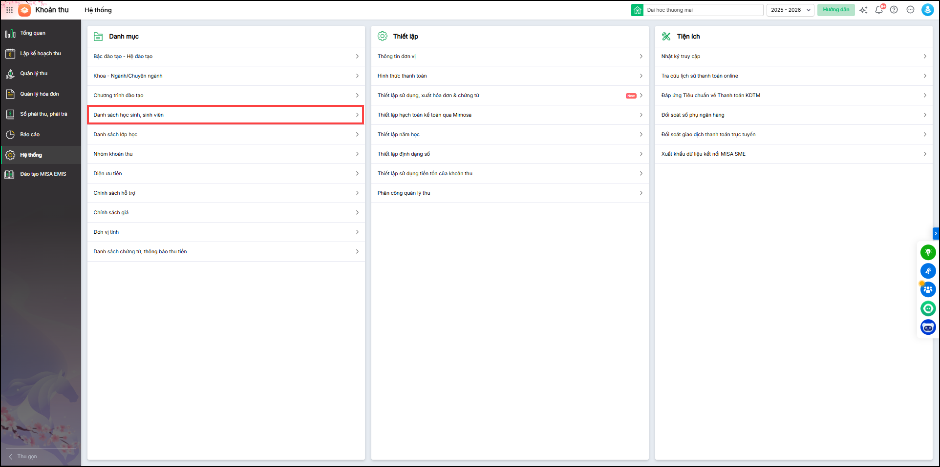 Khi thu tiền nhà trường gửi thông báo thu tiền cho sinh viên trên website gồm thông tin các khoản thu phải nộp, tổng tiền và cú pháp chuyển khoản (nếu học sinh chuyển khoản). Ví dụ: Cú pháp là: <Tên học sinh><Mã thanh toán> chuyển khoản HKI năm học 2025-2026. Sau khi nhận được số tiền thanh toán của học sinh, nhà trường sẽ đối soát giao dịch dựa vào mã thanh toán với số tiền còn nợ của học sinh để gạch nợ.