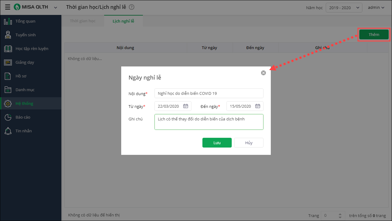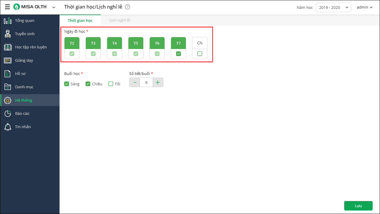 - Vào menu Hệ thống\Thời gian học, lịch nghỉ lễ