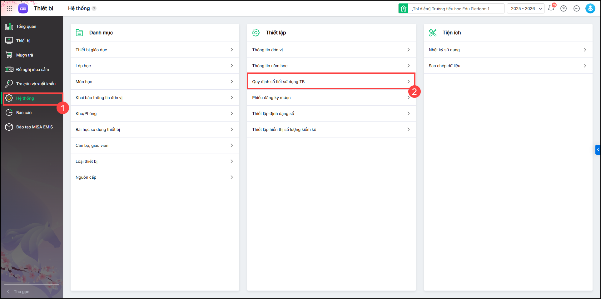 1. Vào Hệ thống/Quy định số tiết sử dụng TB