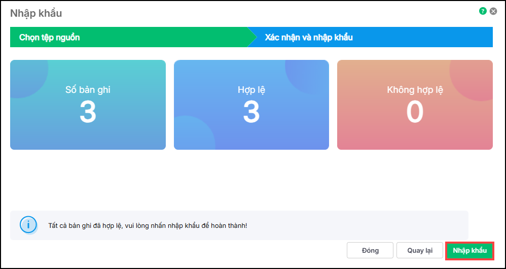 5. Phần mềm hiển thị số lượng các bản ghi hợp lệ, bản ghi không hợp lệ. Nhấn Nhập khẩu