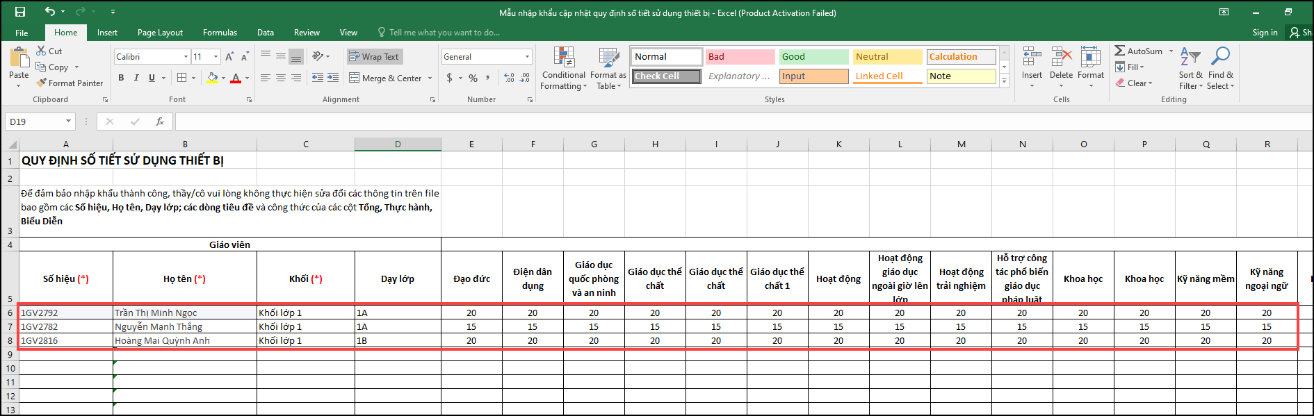 3. Anh/chị điền số hiệu giáo viên, tên, khối, lớp, số lượng tiết sử dụng thiết bị tại mỗi môn học tại tệp dữ liệu vừa tải về từ phần mềm.
