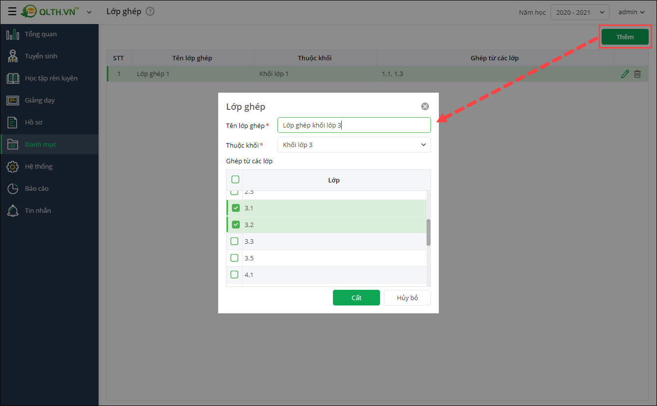 - Nhấn Thêm và khai báo thông tin về lớp ghép: Tên lớp ghép, Thuộc khối, Tích chọn các lớp cần ghép.