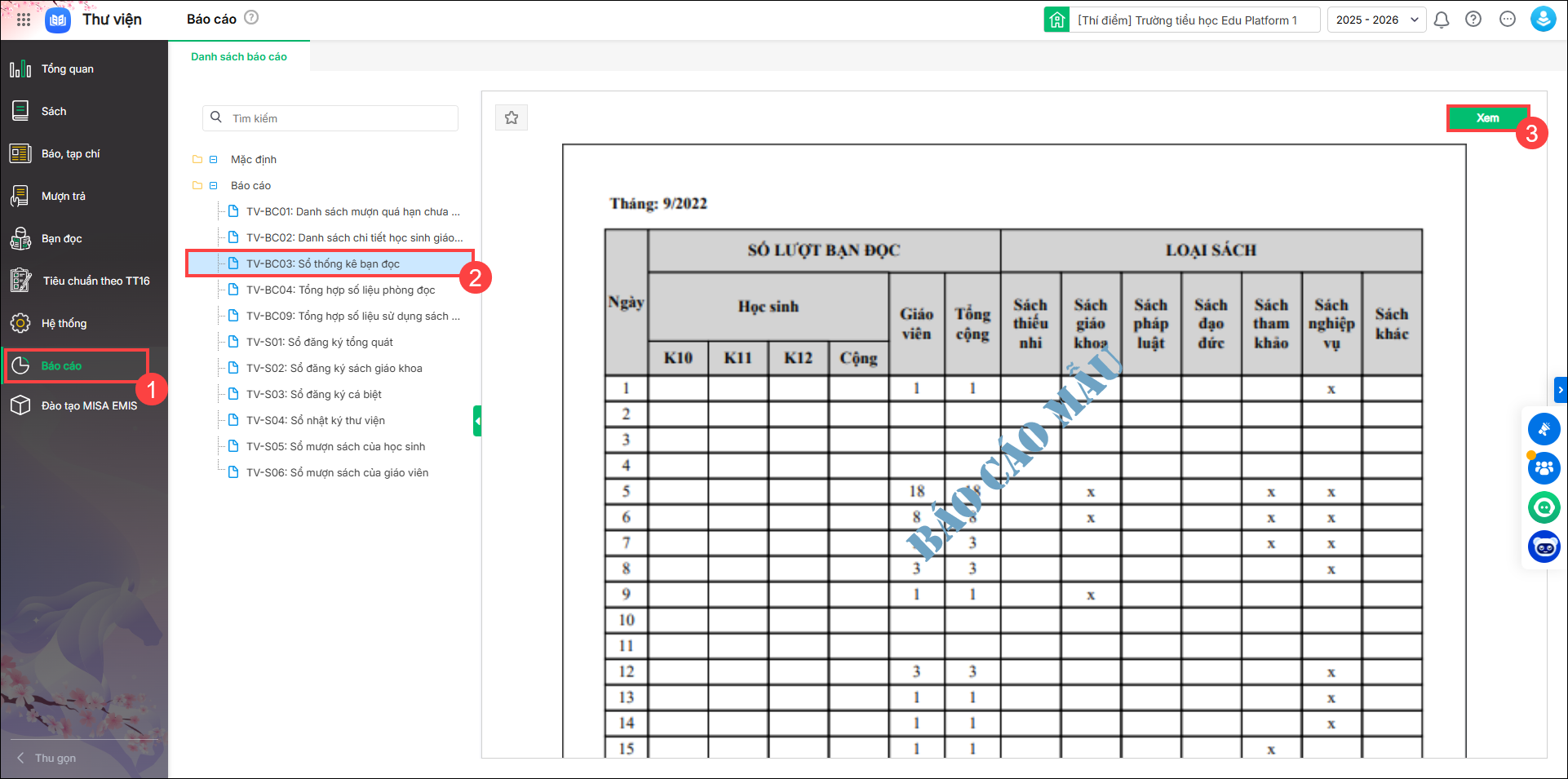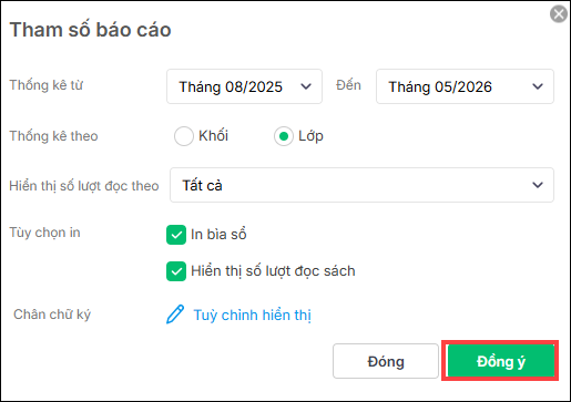 + Lớp có tiết đọc tại thư viện: Báo cáo sẽ lấy lên số lượt đọc của học sinh có tiết đọc tại thư viện thống kê theo lớp.