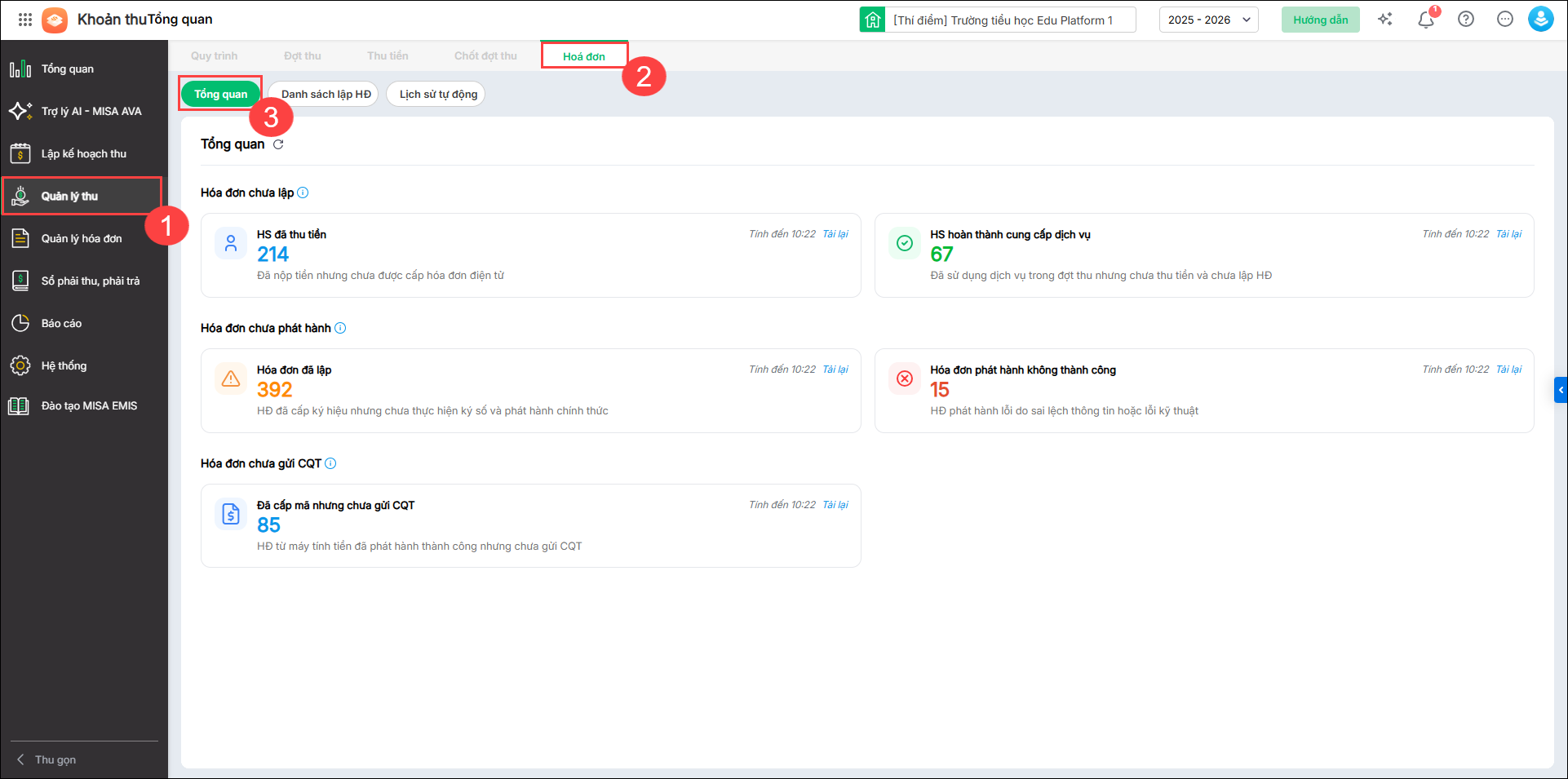 2. [EMIS Khoản thu] Theo dõi nhanh các chỉ số về hóa đơn chưa lập, chưa phát hành, chưa gửi Cơ quan Thuế