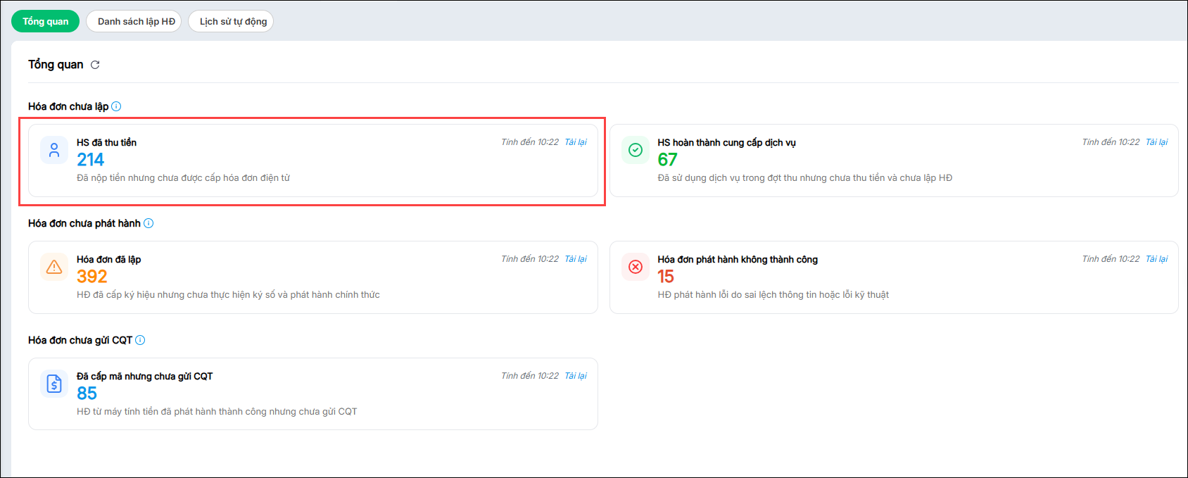 [EMIS Khoản thu] Theo dõi nhanh các chỉ số về hóa đơn chưa lập, chưa phát hành, chưa gửi Cơ quan Thuế