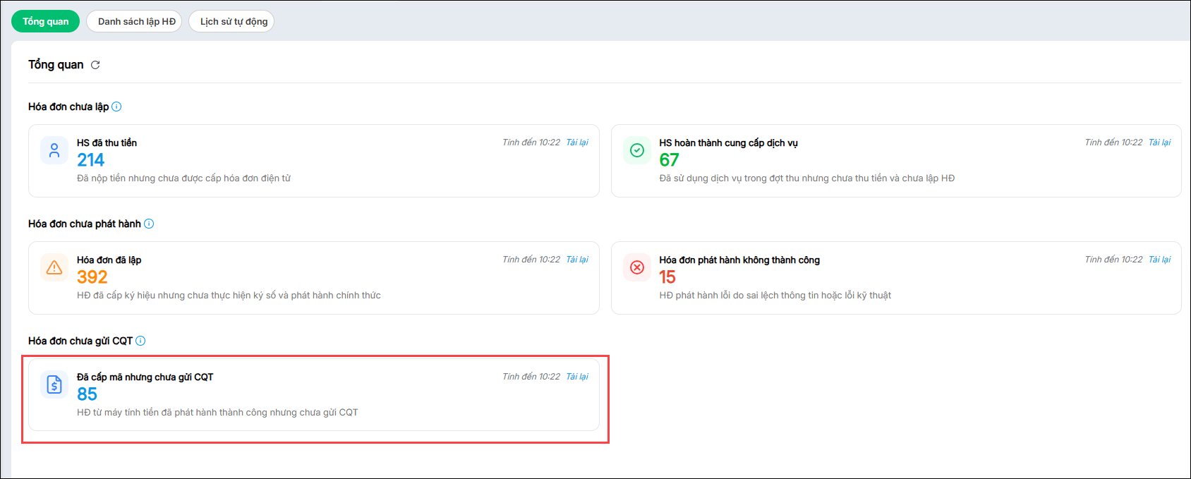 • Hóa đơn chưa gửi Cơ quan thuế: Hóa đơn từ máy tính tiền đã phát hành nhưng chưa gửi tới cơ quan thuế