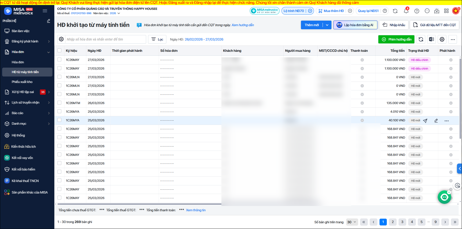 • Chương trình thống kê số lượng HĐ từ máy tính tiền đã phát hành thành công nhưng chưa gửi CQT