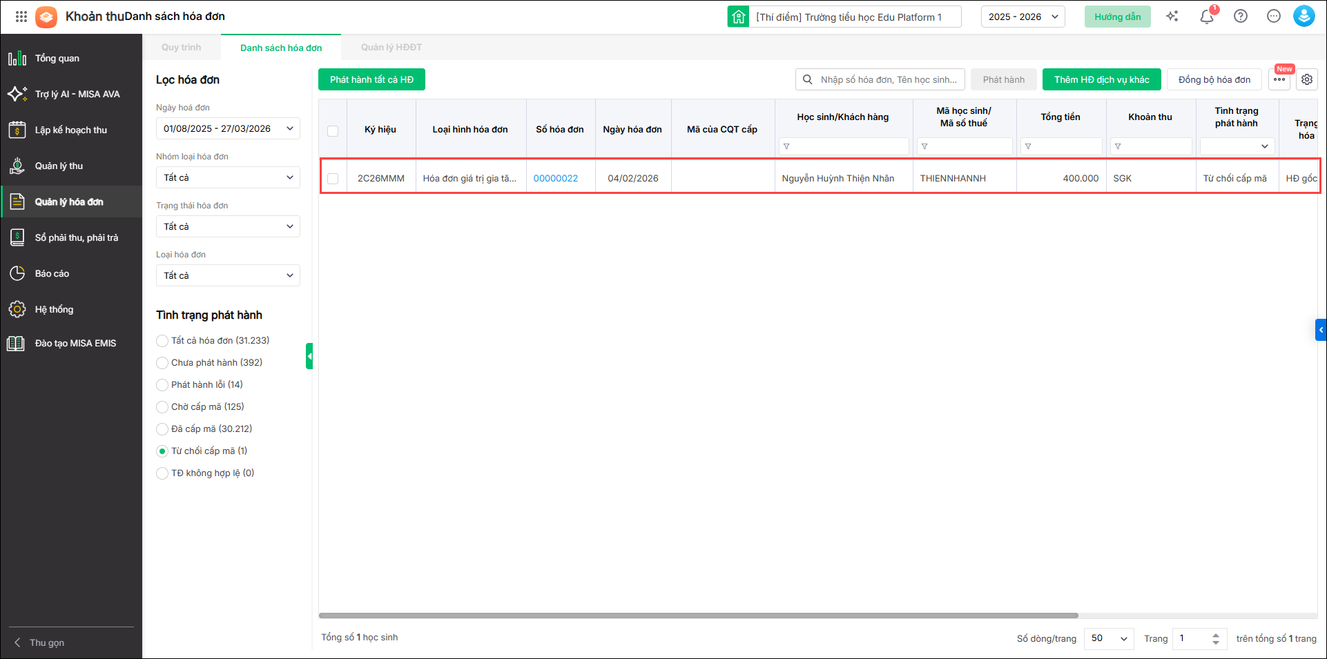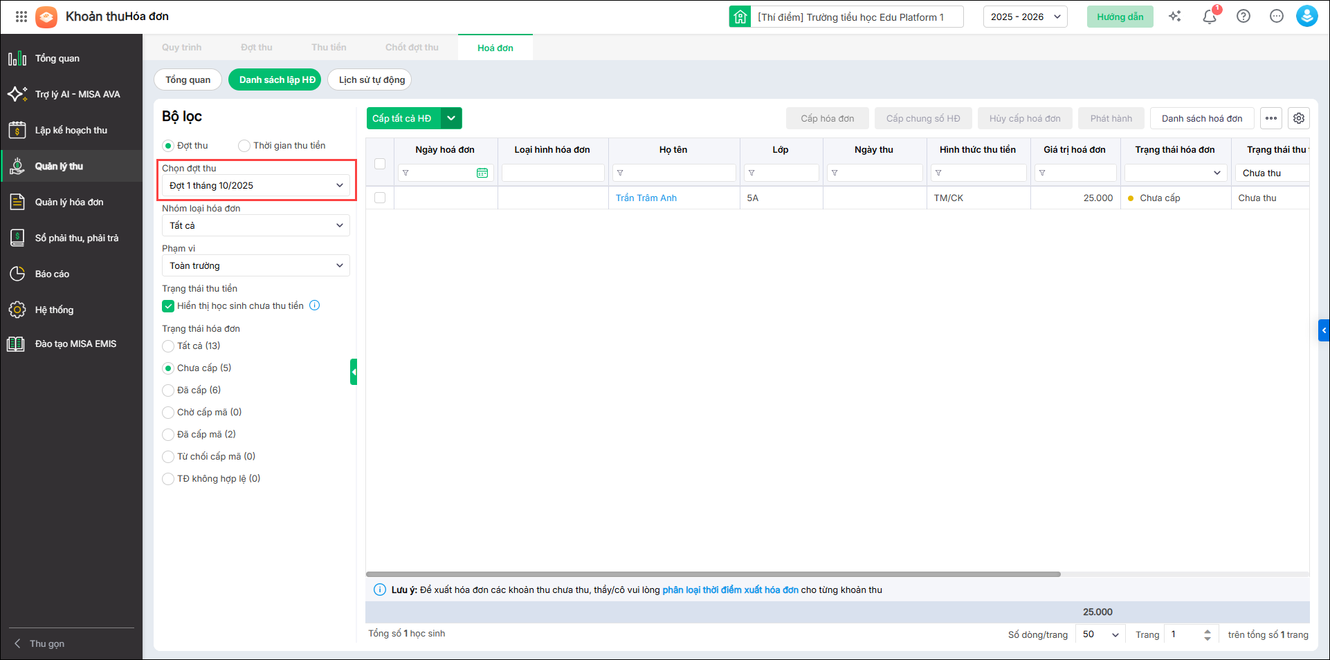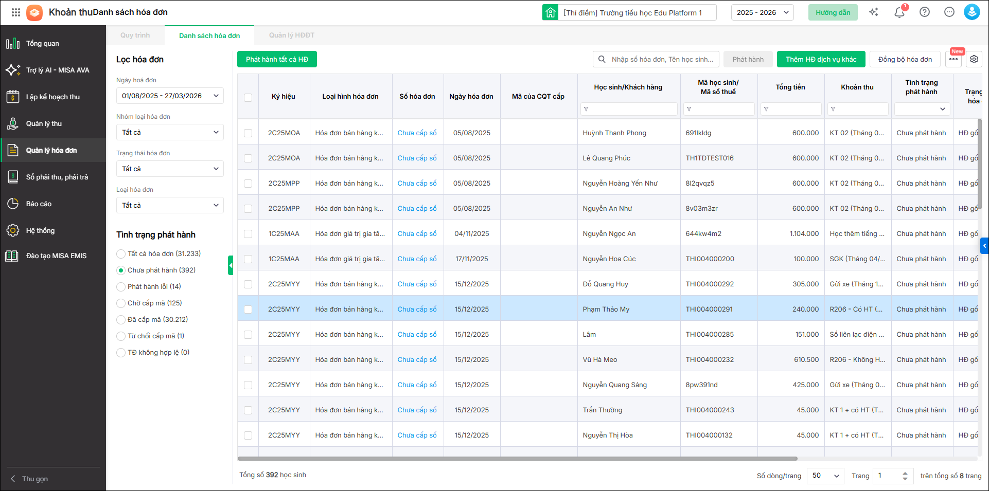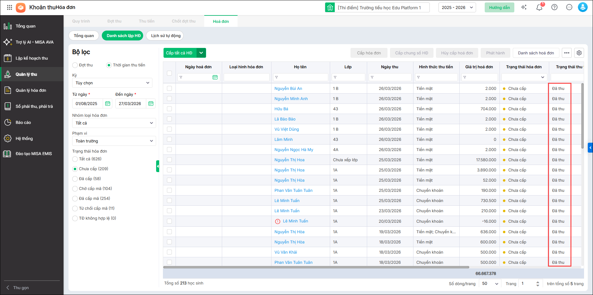 • HS đã thu tiền: Chương trình thống kê số học sinh đã thu tiền nhưng chưa được cấp hóa đơn điện tử.