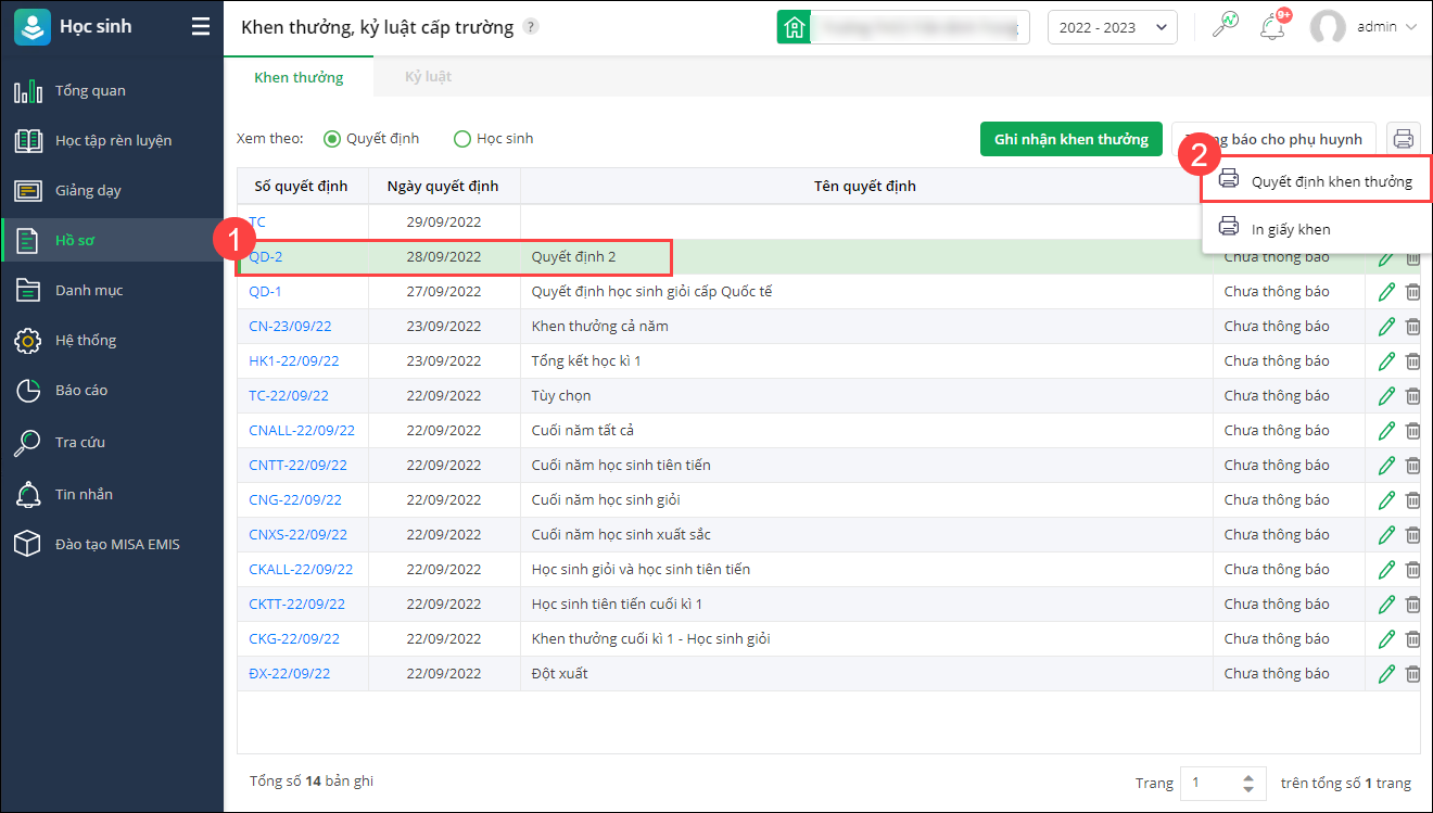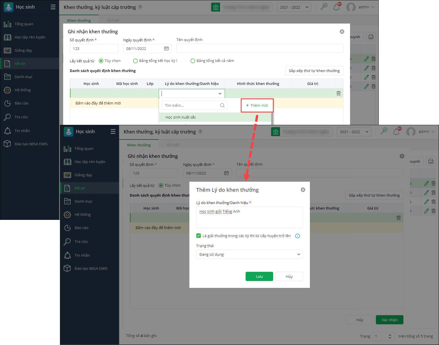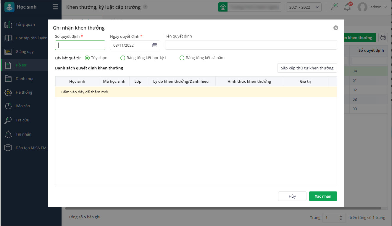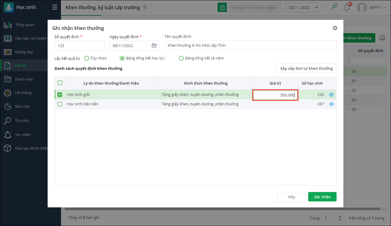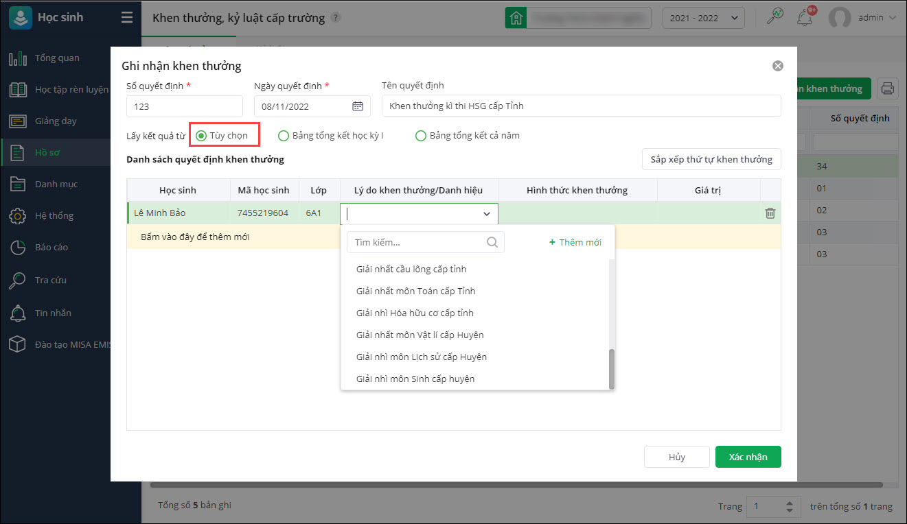 Trường hợp 1: Lập quyết định khen thưởng cho học sinh giỏi cấp huyện, tỉnh, thành tích nổi bật,…. hoặc lý do bất kì anh/chị chọn Lấy kết quả từ Tùy chọn.