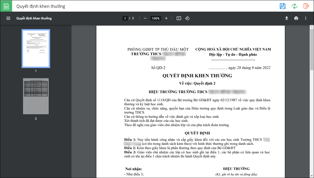- Phần mềm lấy lên quyết định khen thưởng đã chọn, anh/chị có thể tải về máy hoặc in quyết định.