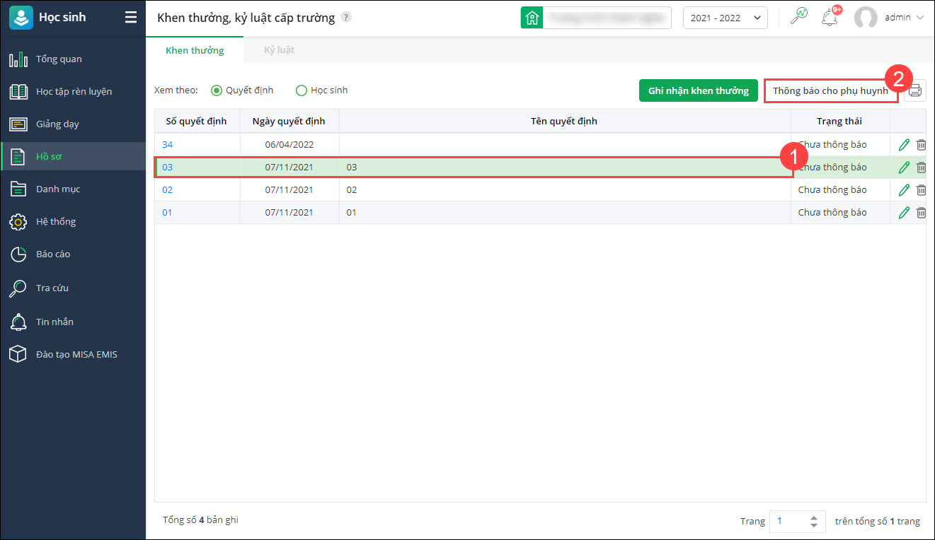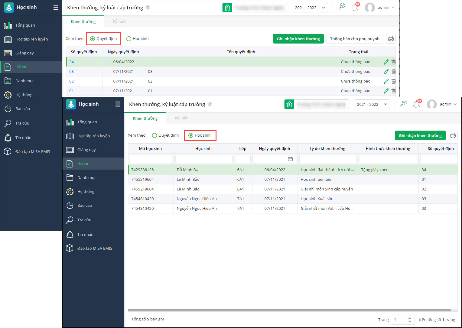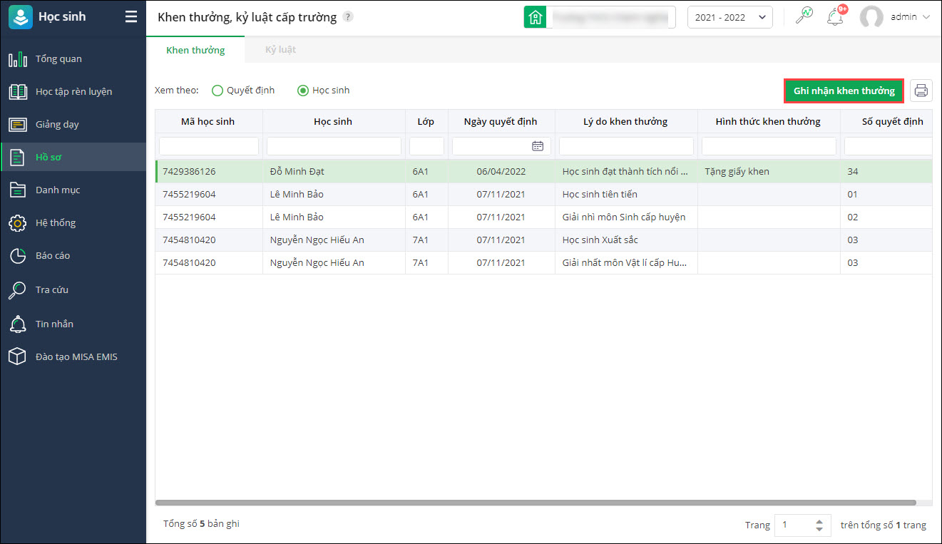 - Để ghi nhận thành tích khen thưởng của học sinh, nhấn Ghi nhận khen thưởng.
