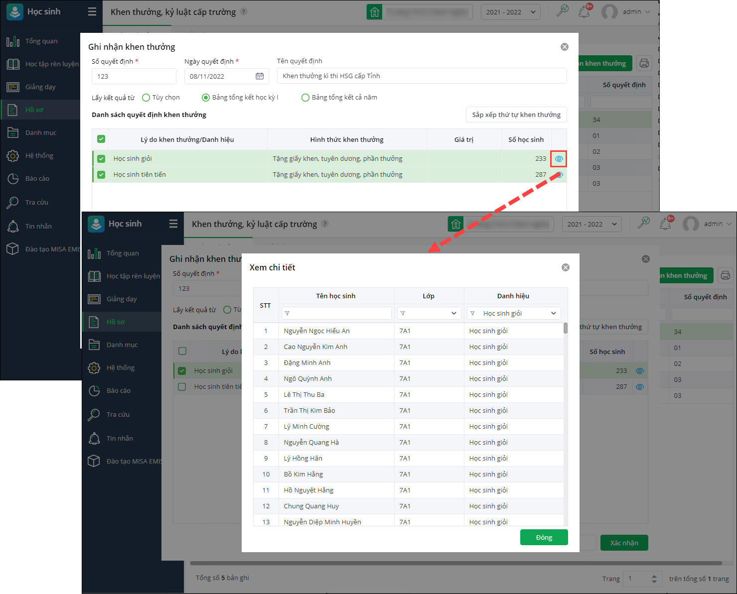 - Nhấn vào biểu tượng đôi mắt để xem danh sách học sinh được khen thưởng theo từng danh hiệu tương ứng.
