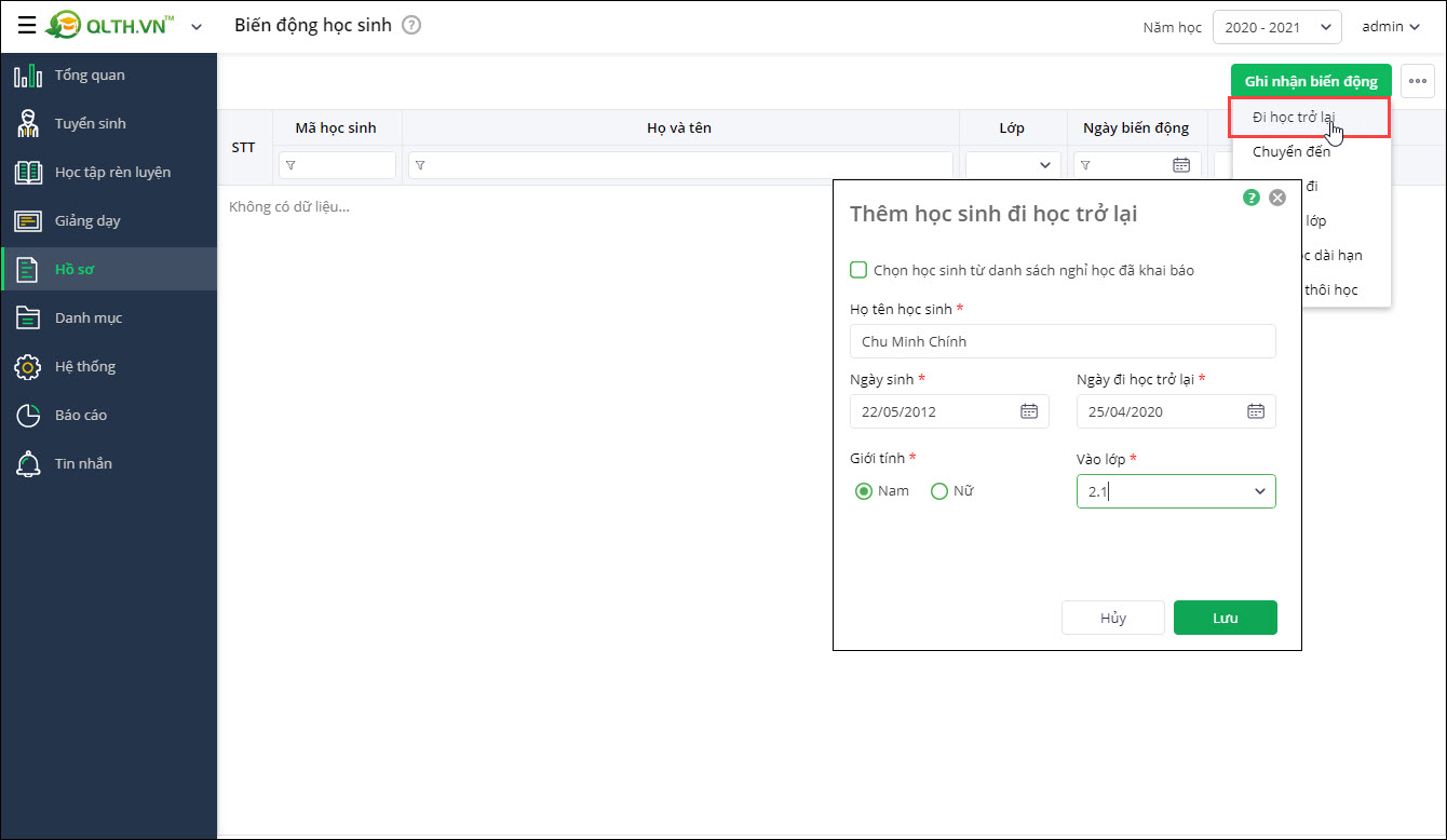 Giúp văn thư ghi nhận học sinh đi học trở lại trong trường hợp trường có sử dụng phân hệ Học sinh.