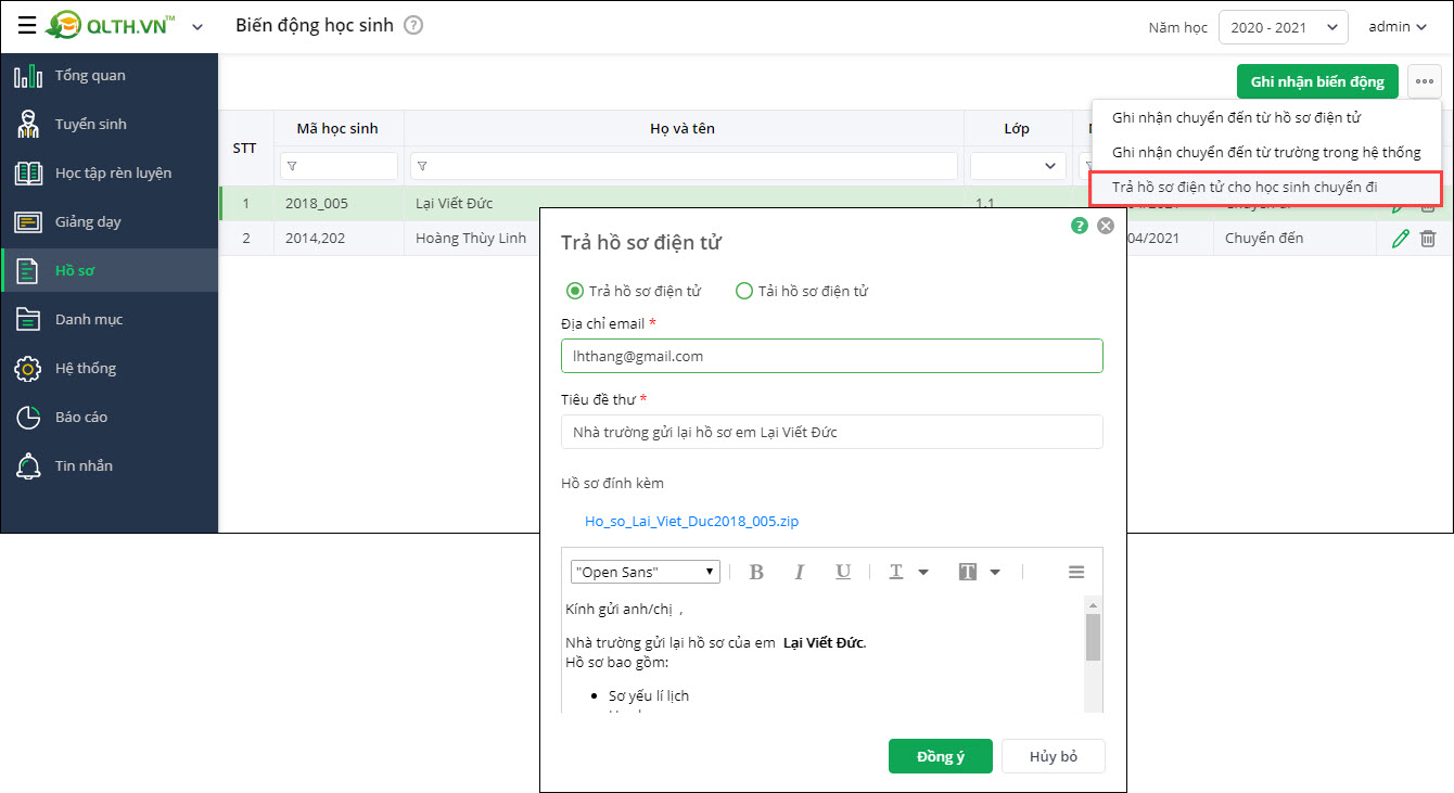 • Nhấn Đồng ý. Phần mềm sẽ gửi hồ sơ điện tử của học sinh chuyển đi vào email đã khai báo.