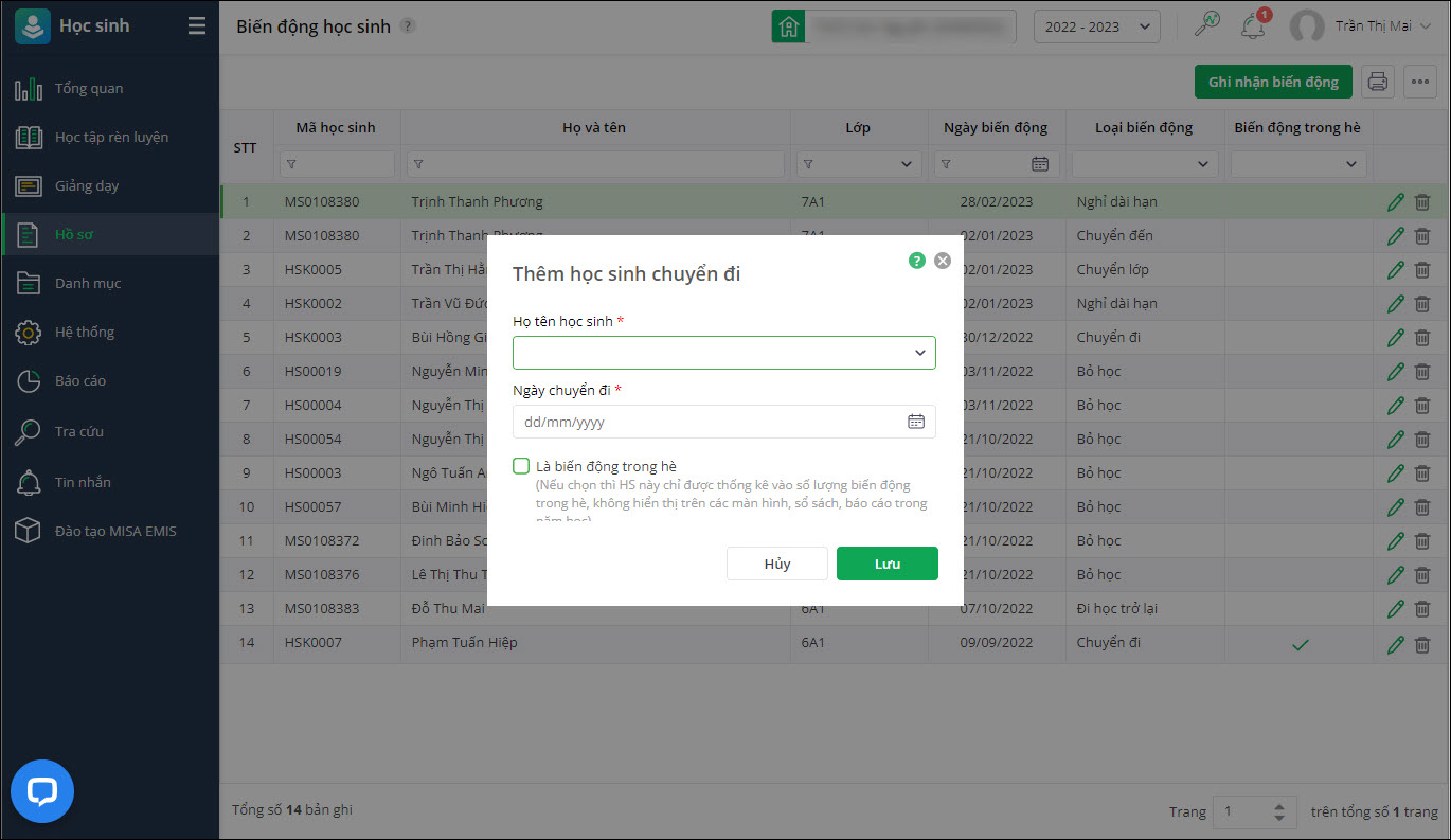 • Tùy chọn Là biến động trong hè: Tích chọn nếu muốn học sinh này chỉ được thống kê vào số lượng biến động trong hè, không hiển thị trên các màn hình, sổ sách, báo cáo trong năm học