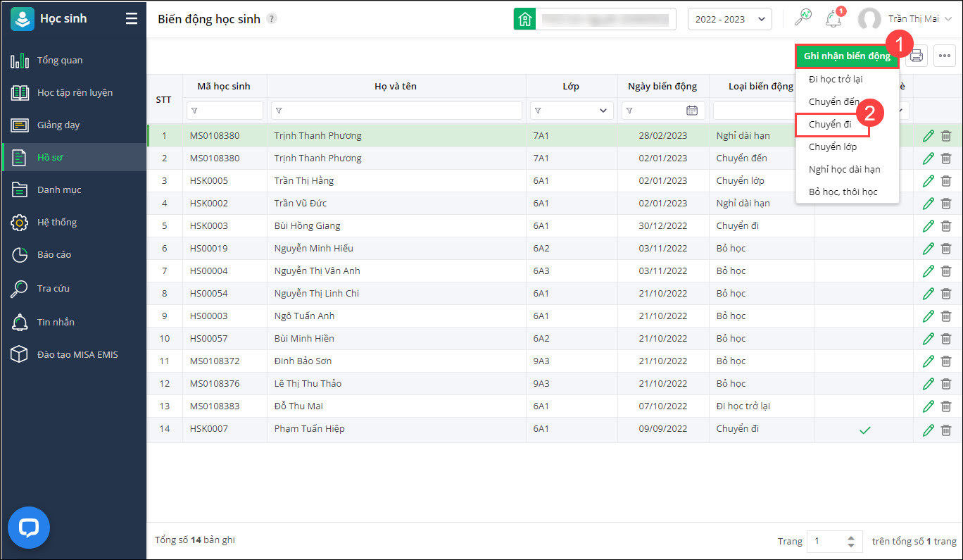 Mục đích: Giúp văn thư ghi nhận học sinh chuyển đi trong trường.