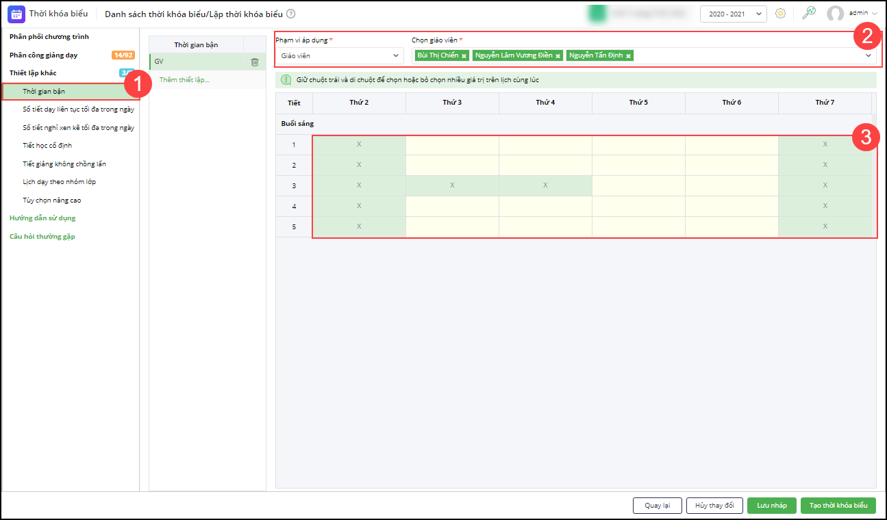 - Tích chọn thời gian bận của giáo viên trong trường, nhấn Lưu nháp