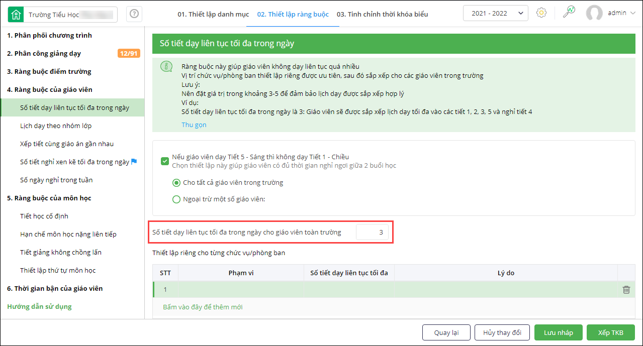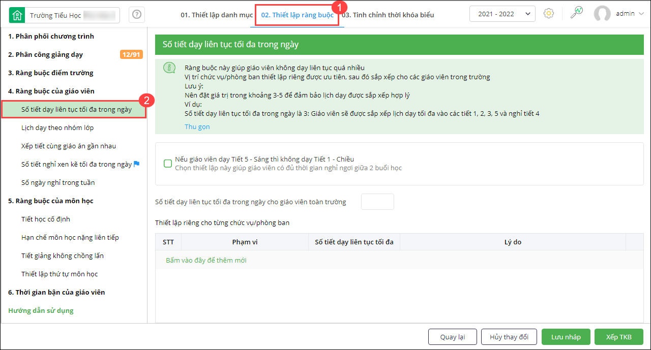 Ví dụ: Ban giám hiệu chỉ dạy tối đa 2 tiết liên tục vì cần thời gian cho công tác điều hành, anh/chị thực hiện thiết lập số tiết dạy tối đa cho Ban giám hiệu là 2.
