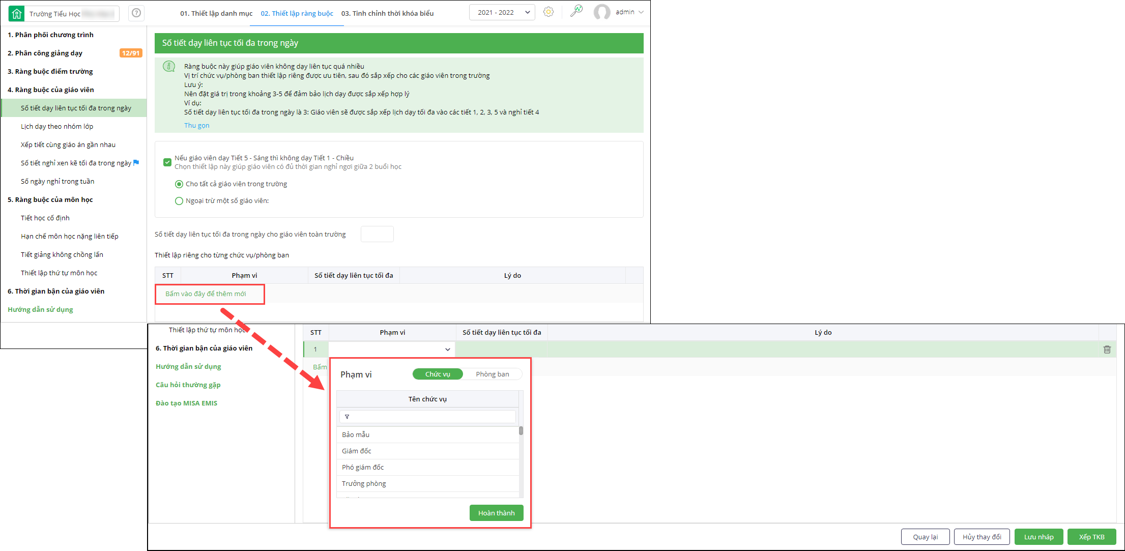 Trường hợp có phòng ban/chức vụ có số tiết dạy liên tục tối đa khác với thiết lập chung của toàn trường, anh/chị thực hiện Thiết lập riêng cho Phòng ban/chức vụ đó.