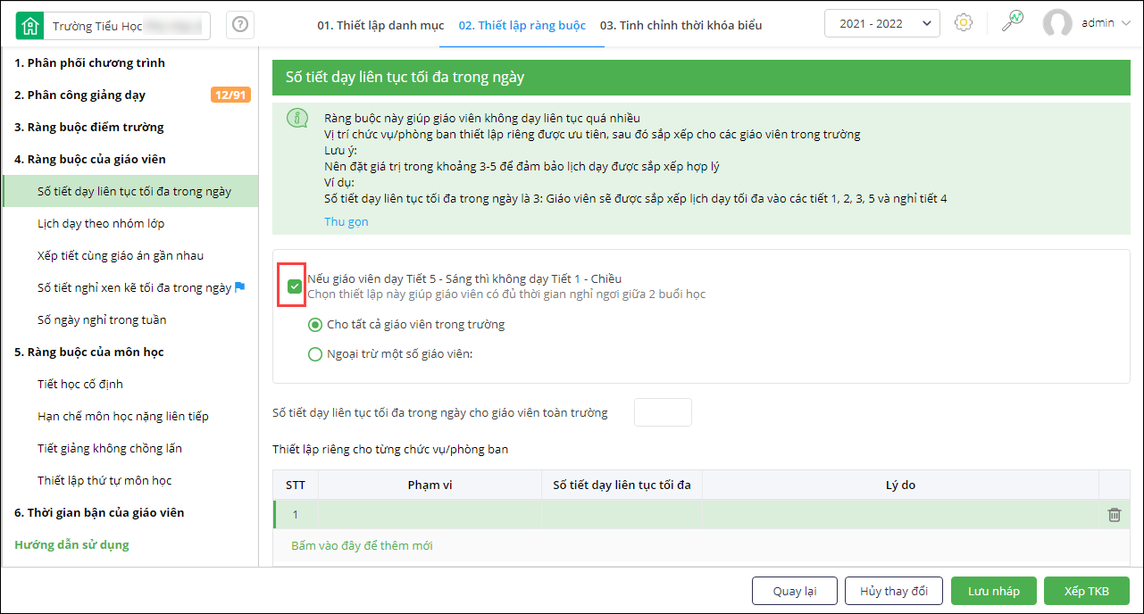 Trường hợp có phòng ban/chức vụ có số tiết dạy liên tục tối đa khác với thiết lập chung của toàn trường, anh/chị thực hiện Thiết lập riêng cho Phòng ban/chức vụ đó.