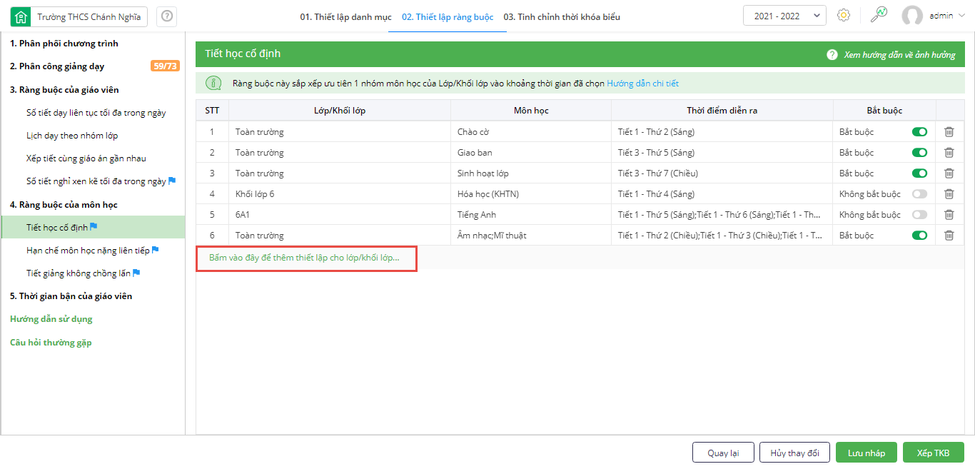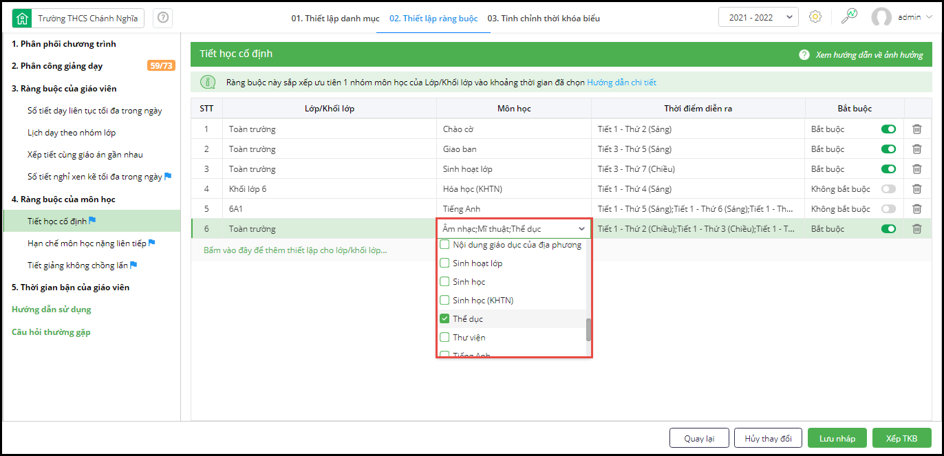 Ví dụ: Anh/chị thiết lập cố định môn tiết “Chào cờ” vào thứ 2 đầu tuần, tiết “Sinh hoạt” vào tiết cuối tuần cho toàn trường. Hay dễ dàng thiết lập tiết thể dục không vào tiết đầu/tiết cuối mỗi buổi học.