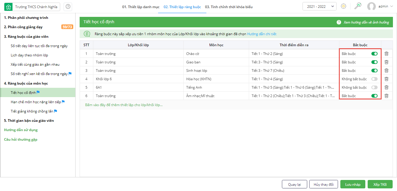 Lưu ý: Chỉ bắt buộc ưu tiên tiết học trong trường hợp cần thiết. Nếu thiết lập bắt buộc ưu tiên quá nhiều thì các tiết học sẽ mâu thuẫn với nhau, thời khóa biểu khó sắp xếp được lịch học mong muốn.