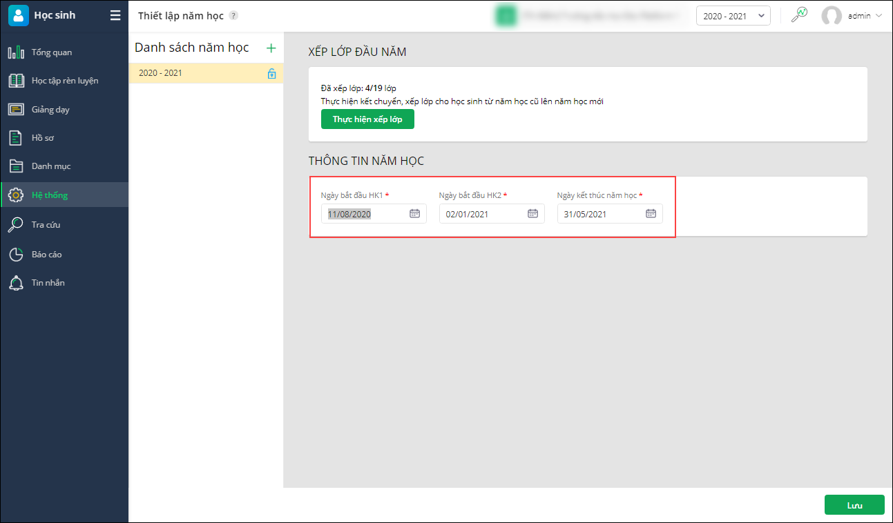 - Vào Hệ thống\Thiết lập năm học