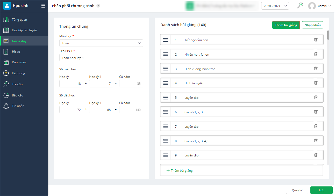 - Trường hợp anh/chị muốn thêm mới bài giảng vào phân phối chương trình thì có thể nhấn Thêm bài giảng và khai báo thông tin về bài giảng
