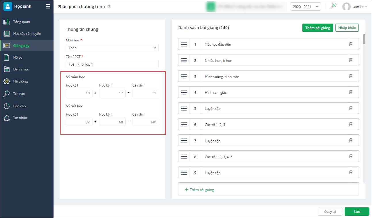 - Thay đổi các thông tin về Số tuần học hoặc Số tiết học theo đúng thực tế tại đơn vị của mình