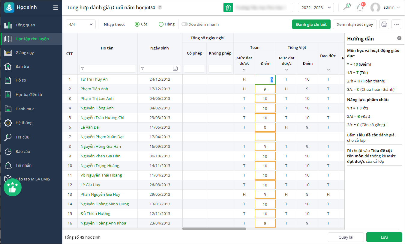 - Tại lớp, kỳ cần thực hiện đánh giá, nhấn chọn vào ô tương ứng để nhập điểm, nhận xét,.. Làm theo hướng dẫn chi tiết nhập điểm trên màn hình.