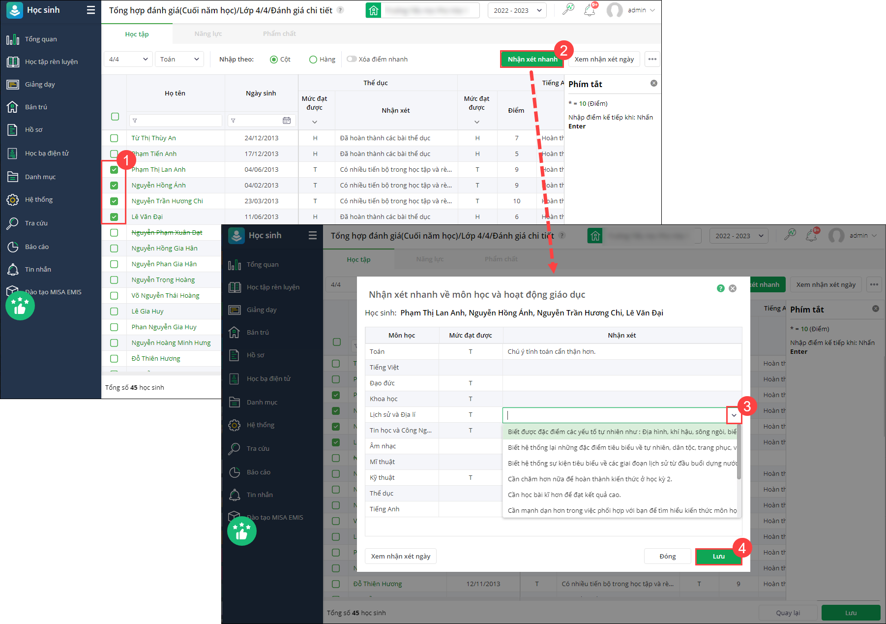 - Trường hợp muốn thực hiện nhập nhanh mức đánh giá và nhận xét cho nhiều học sinh cùng cùng mức đạt được và nhận xét.