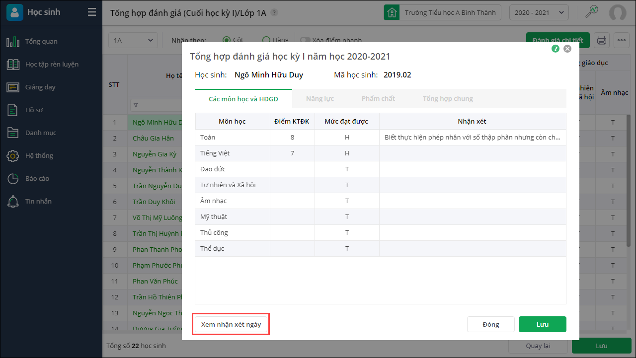 - Nhấn Xem nhận xét ngày để đối chiếu kết quả đánh giá với nhận xét ngày của học sinh.