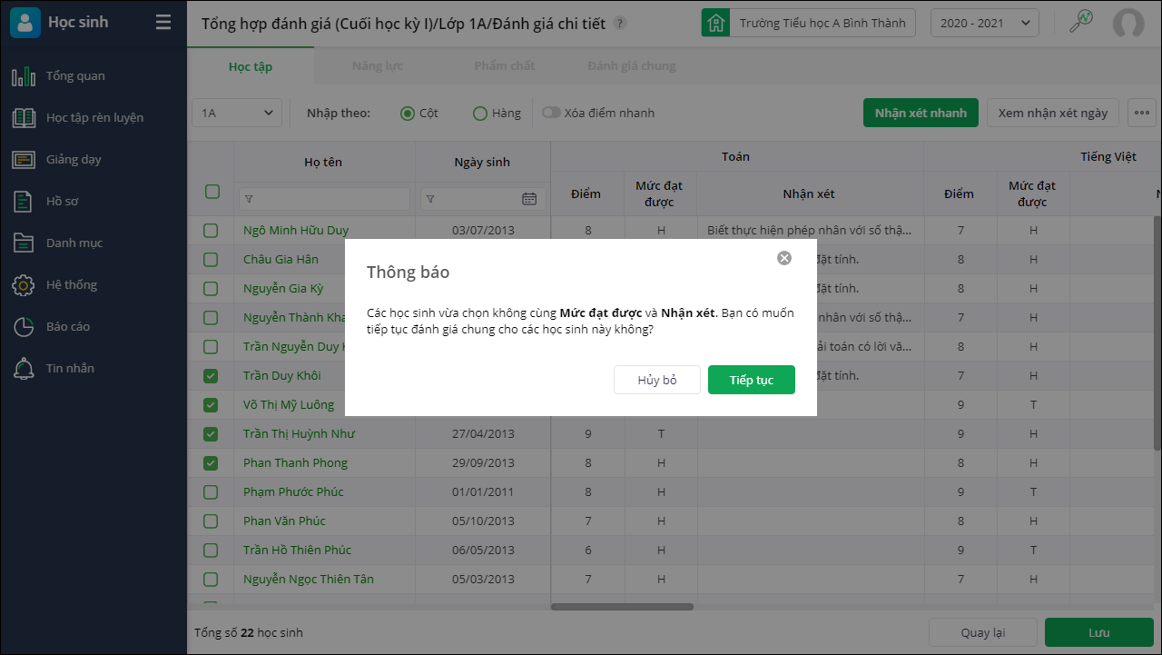 - Nhấn Tiếp tục thực hiện Đánh giá và nhận xét nhanh cho nhiều học sinh không cùng Mức đạt được và Nhận xét