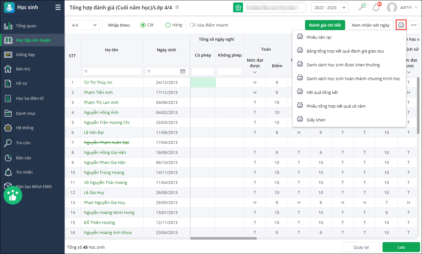 - Nhấn vào biểu tượng máy in để in các báo cáo, tổng hợp kết quả, giấy khen,… của lớp.