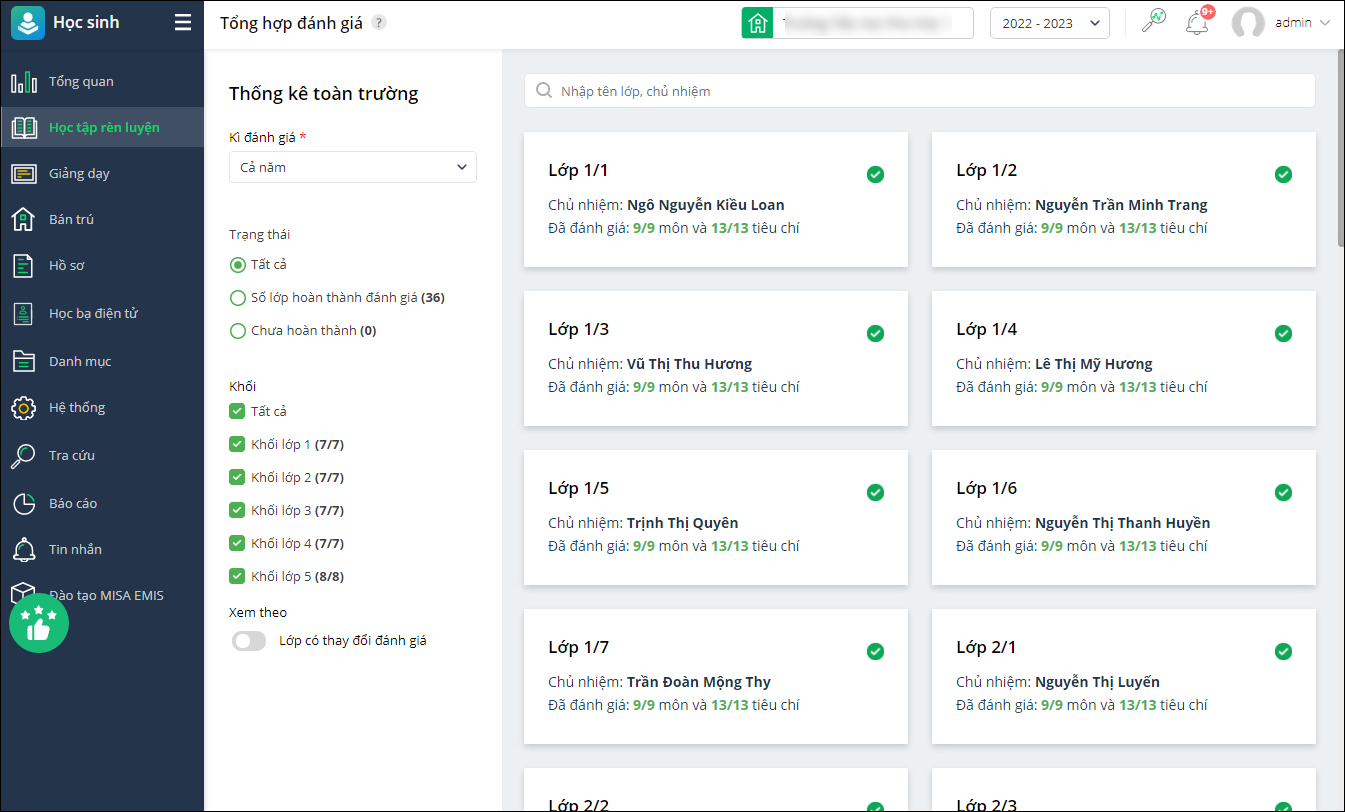 - Hiệu trưởng có thể theo dõi được tình hình Đánh giá học tập của toàn trường.