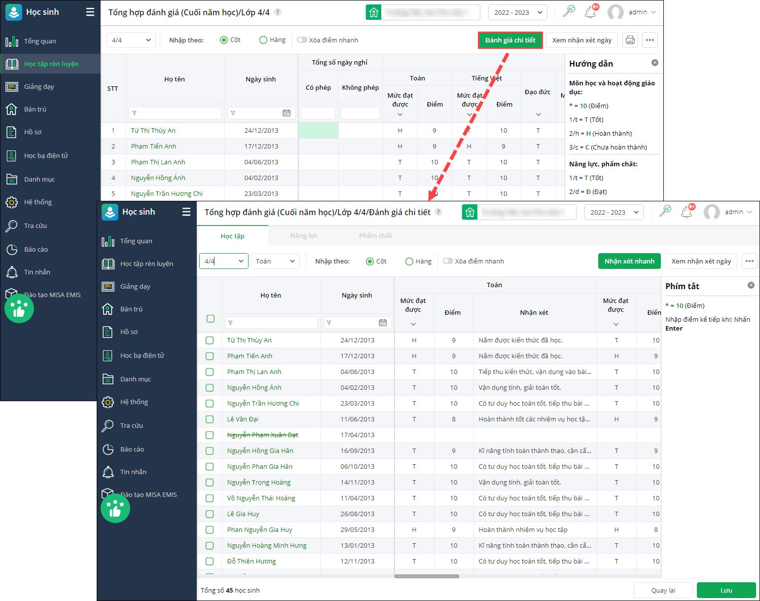 - Để nhập đánh giá chi tiết từng môn học, chọn Đánh giá chi tiết.