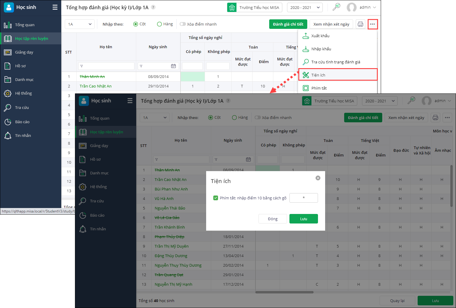 - Để có thể thiết lập nhanh các kí tự nhập điểm 10 anh/chị nhấn Tiện ích. Phần mềm đang tự động thiết lập nhập điểm 10 bằng cách gõ dấu sao (*), anh/chị chỉnh sửa lại theo đúng nhu cầu của bản thân
