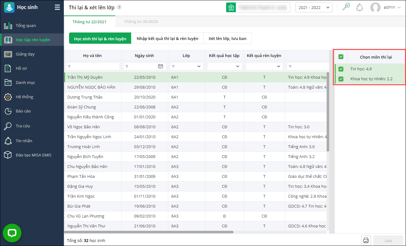 - Phần mềm đã mặc định lựa chọn các môn cần thi lại của học sinh, tuy nhiên anh/chị có thể bỏ tích chọn tại các môn không cần thi lại. Nhấn Lưu.