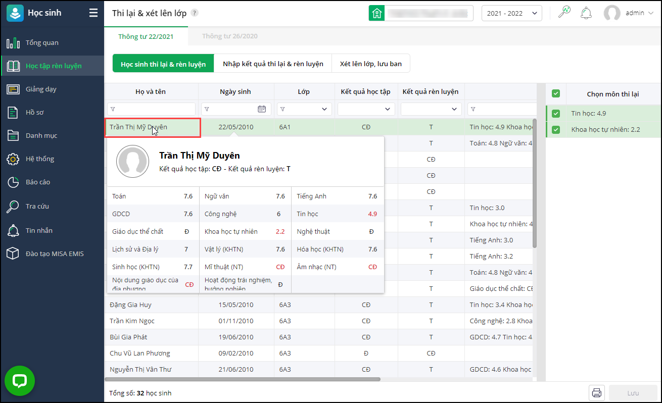 - Tại mục Học sinh thi lại & rèn luyện giáo viên có thể theo dõi được danh sách học sinh có thành tích kém phải thực hiện thi lại và xét lên lớp.
