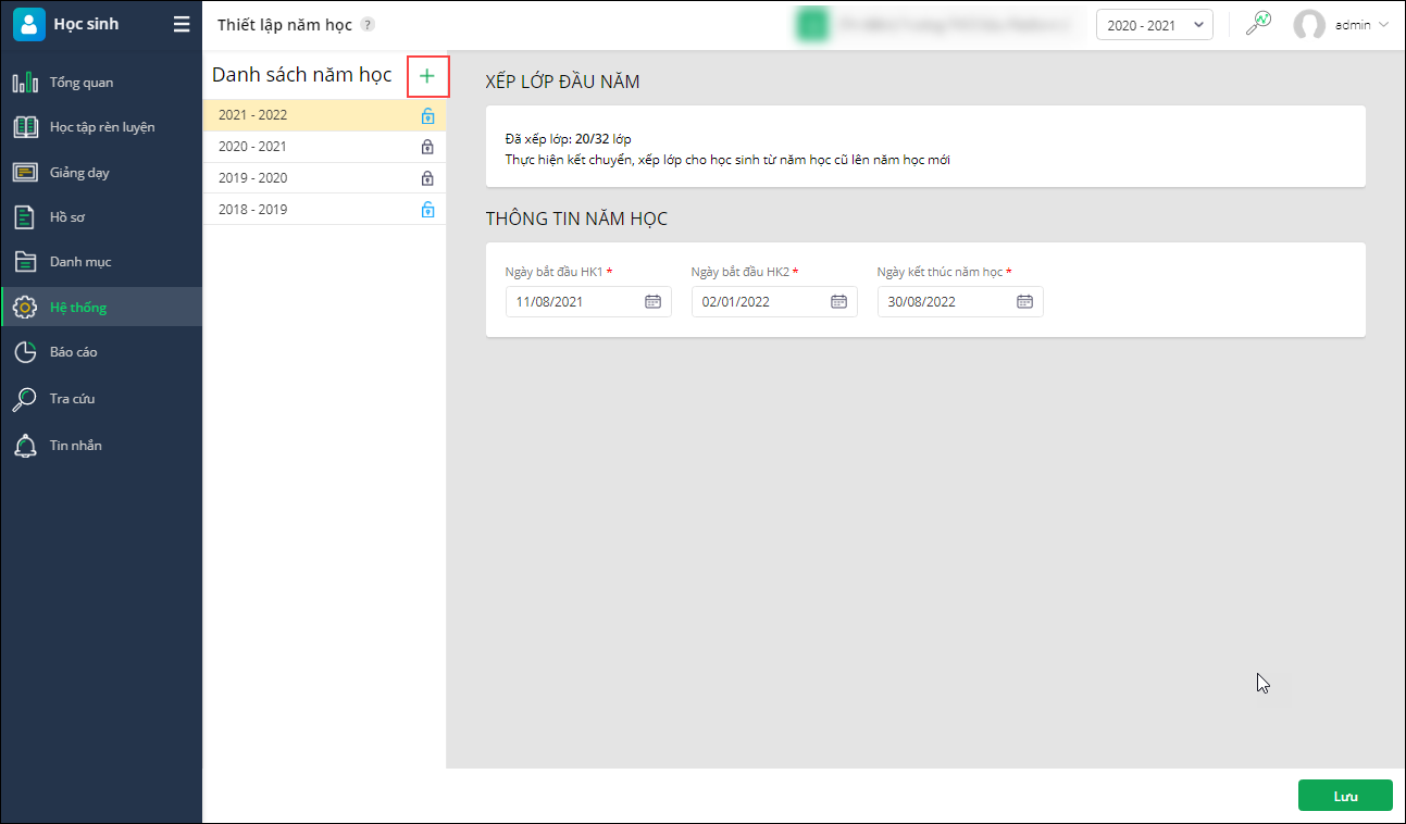 - Vào Hệ thống\Thiết lập năm học, nhấn biểu tượng dấu cộng và thực hiện khởi tạo năm học mới. Nhấn Cất