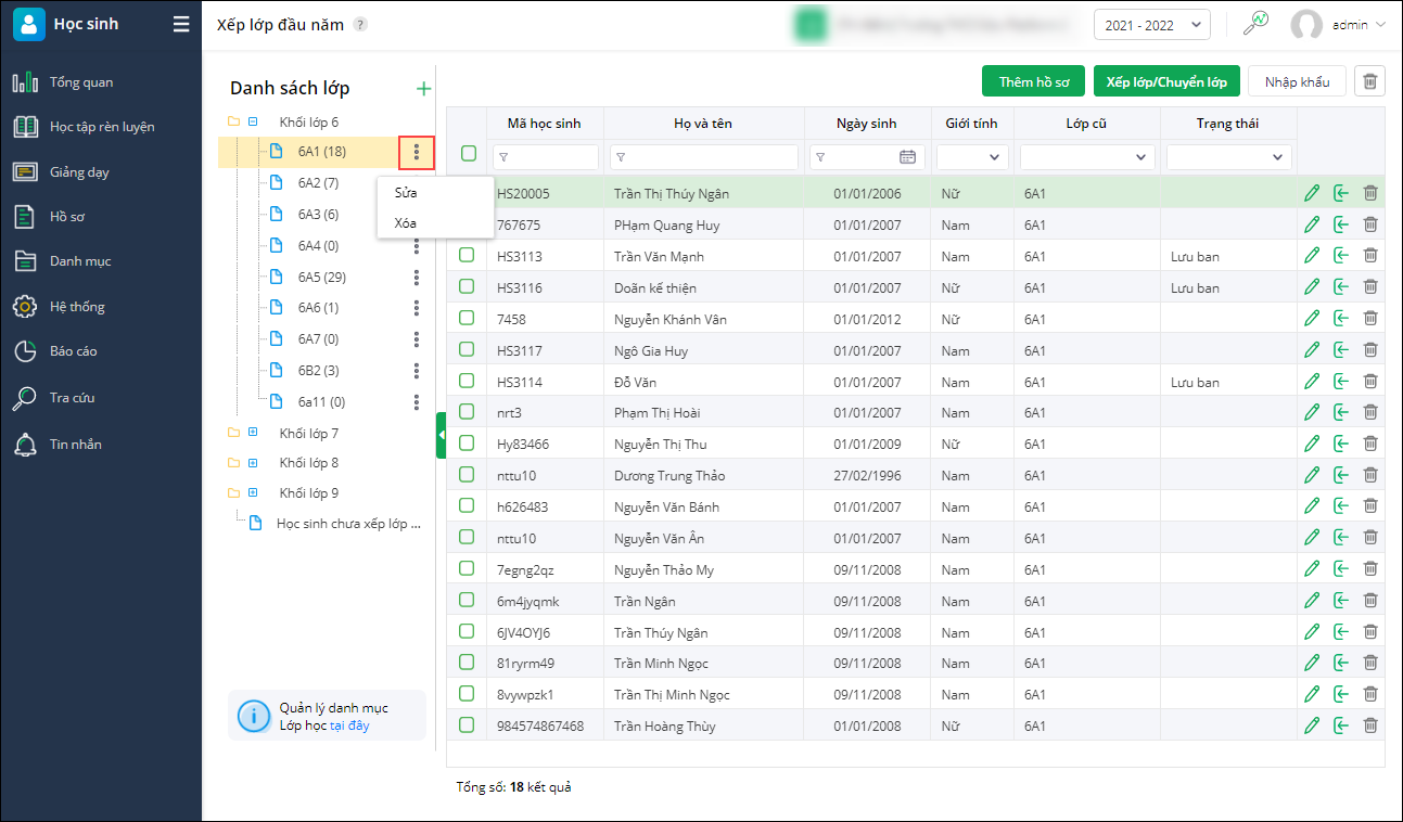 - Trường hợp, đã có học sinh phát sinh dữ liệu thì anh/chị không được phép Xếp lớp/Chuyển lớp mà phải thực hiện ghi nhận biến động học sinh.