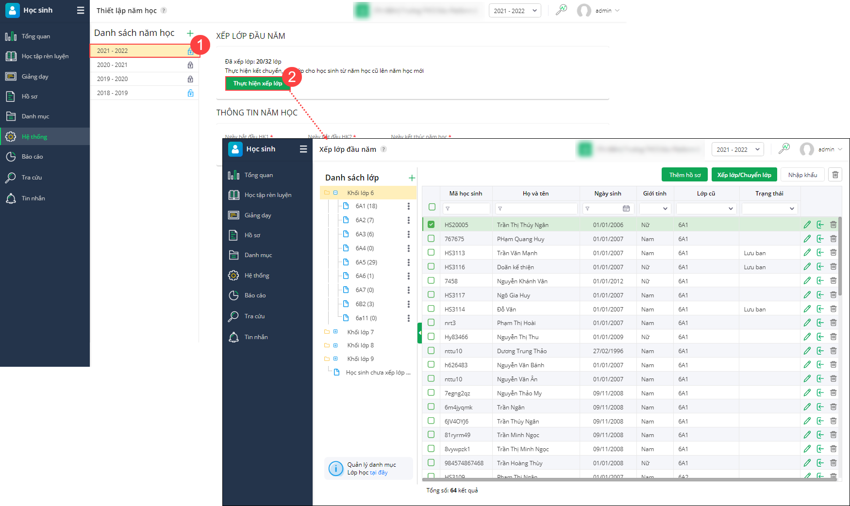 - Lựa chọn năm học mới vừa khởi tạo, nhấn Thực hiện xếp lớp.