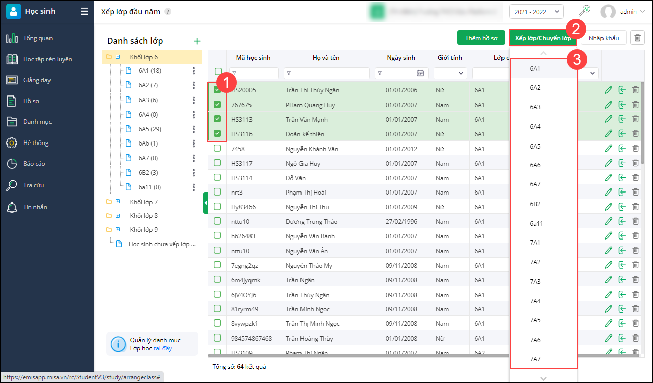 - Tại màn hình Xếp lớp đầu năm, tích chọn học sinh cần chuyển lớp, nhấn Xếp lớp/Chuyển lớp để xếp lại lớp/chuyển lớp cho 1 hay 1 nhóm học sinh.