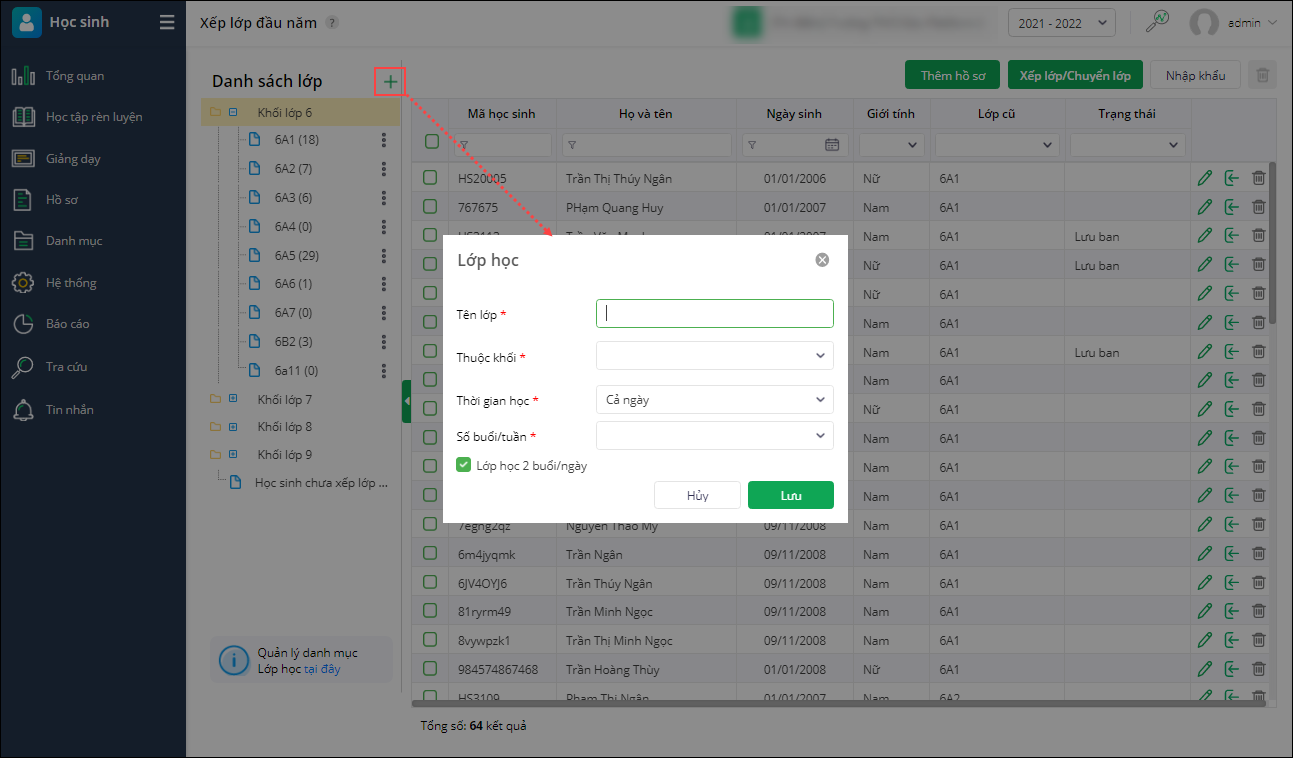 - Tại màn hình Xếp lớp đầu năm, nhấn biểu tượng dấu cộng tại khối lớp để thêm nhanh lớp học trong trường